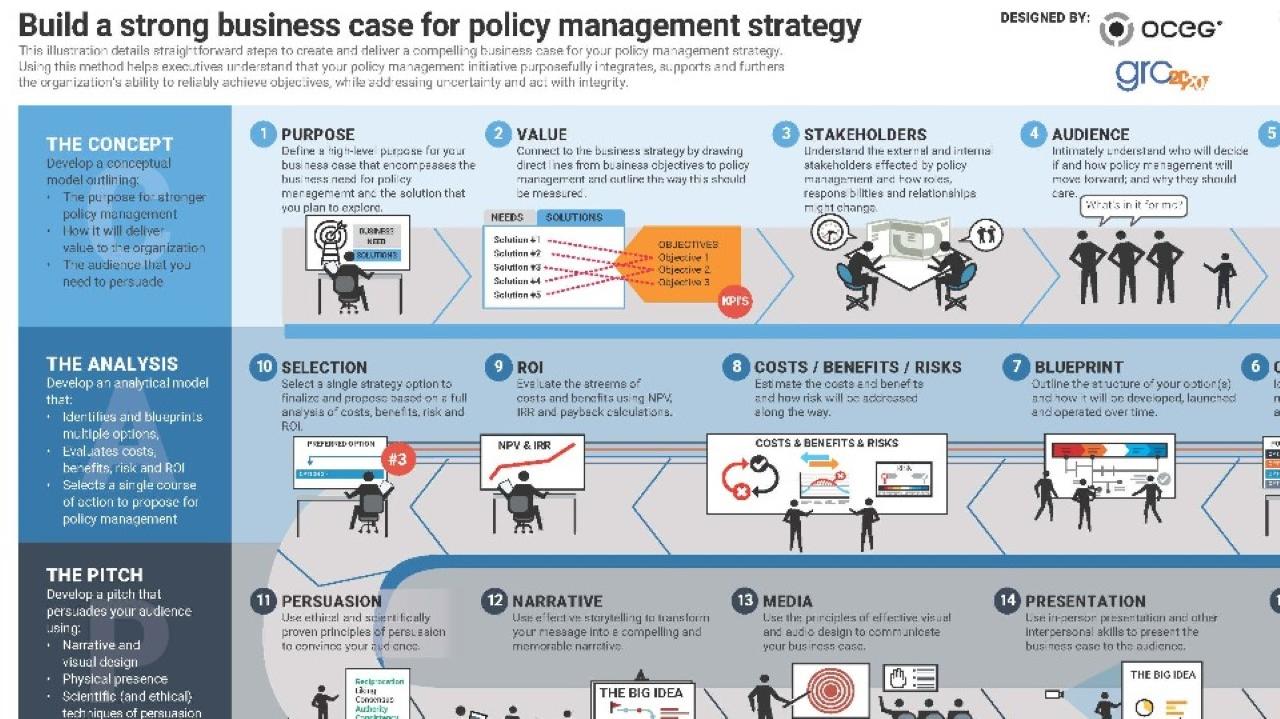 This is part nine of the Policy Management Series. This illustration shows you how to develop and pitch a winning business case for improving your organization’s approach to policy management. We always hear that the biggest challenge to improving policy management is not knowing where to start, but the next and equally difficult challenge is making the business case for change. Creating a winning business case requires several “arts and sciences" including those related to strategy, innovation, planning, financial analysis, narrative, media design, and persuasion. This illustration outlines our step-by-step Winning Business Case Model that details straightforward iterative steps to create and deliver a compelling business case for your policy management change project.