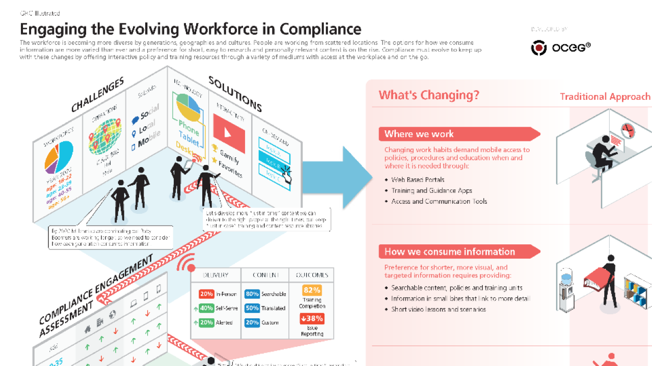 People are working from scattered locations. The options for how we consume information are more varied than ever and a preference for short, easy to research and personally relevant content is on the rise. Compliance must evolve to keep up with these changes by offering interactive policy and training resources through a variety of mediums with access at the workplace and on the go.