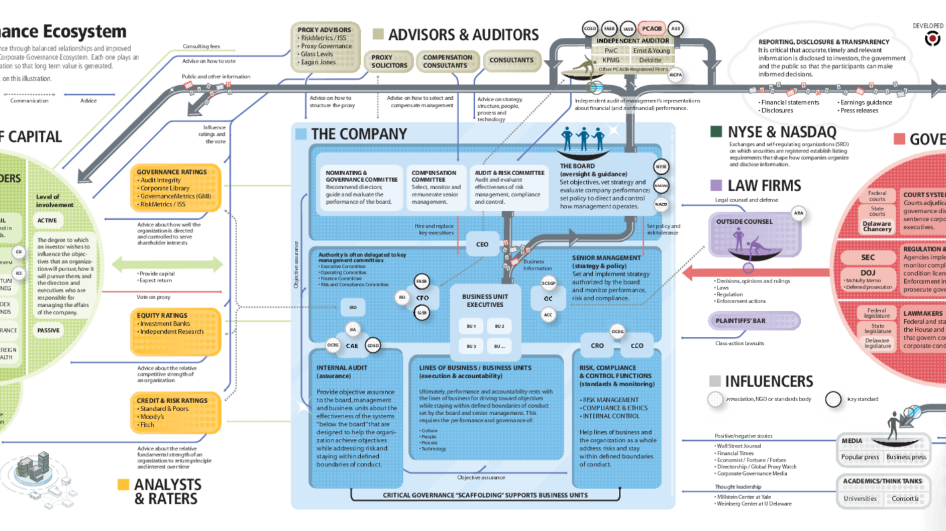 There are many participants in the Corporate Governance Ecosystem. Each one plays an important role in directing and controlling an organization so that long term value is generated. Use this illustration with your team to discuss the flow of control, capital, communication, and advice for the following corporate governance constituents: