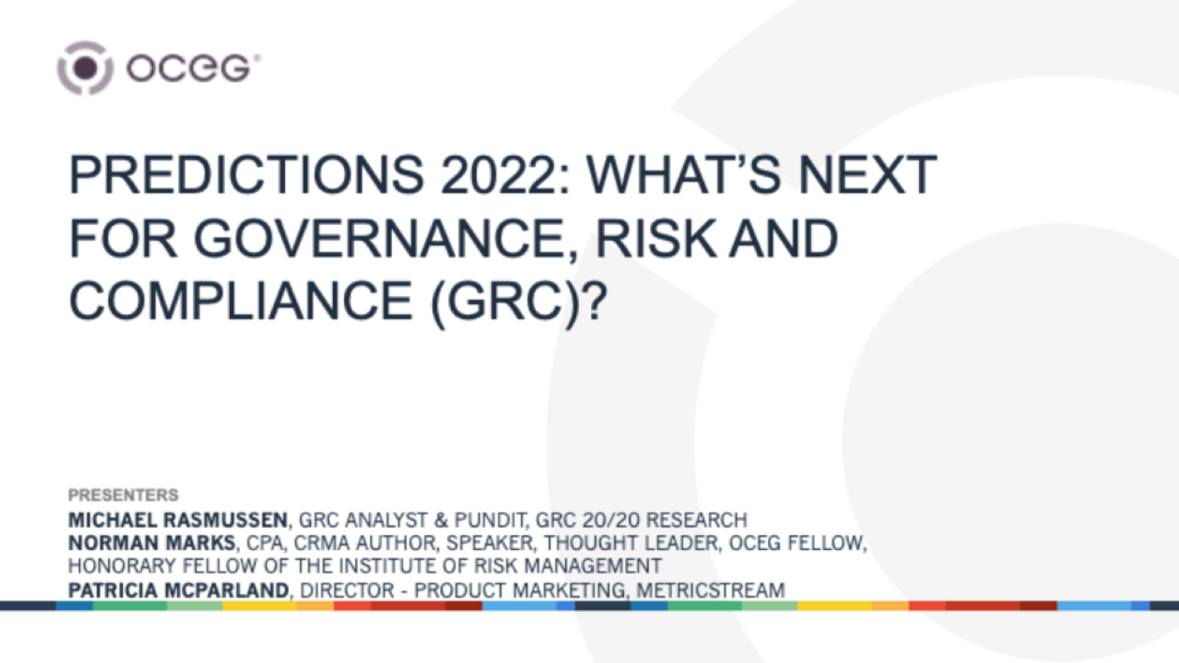 Join two renowned GRC experts and OCEG™ Fellows, Michael Rasmussen of GRC 20/20 and Norman Marks, as they share their predictions of what GRC will look like in 2022 and beyond.