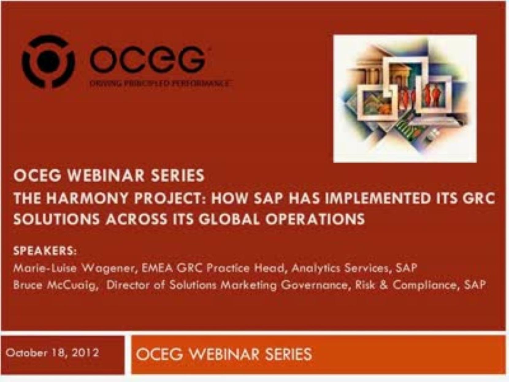 Building on its Principled Performance Prize winning GRC initiative in Sybase, SAP is now completing implementation of its Harmony Project. This project is one of the world’s largest top down implementations of governance, risk and compliance solutions.